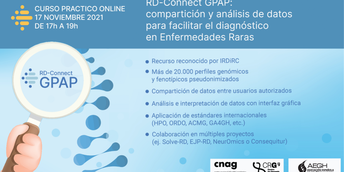 La Asociación Española de Genética Humana (AEGH) y el Centro Nacional de Análisis Genómico (CNAG-CRG) organizan un curso práctico sobre la plataforma europea RD-Connect GPAP, reconocida por el International Rare Disease Consortium (IRDiRC). La RD-Connect GPAP, coordinada y desarrollada por el CNAG-CRG, permite integrar, compartir y analizar datos genómicos y fenotípicos de manera segura entre los equipos clínicos y de investigación autorizados, facilitando el diagnóstico de Enfermedades Raras y la identificación de nuevas asociaciones gen-enfermedad. La interfaz gráfica de la plataforma y sus numerosos recursos conectados permiten analizar e interpretar datos de manera eficaz e intuitiva sin necesidad de tener formación en Bioinformática. La plataforma hospeda actualmente datos pseudonimizados de más de 20.000 pacientes y familiares y ha contribuido al diagnóstico de cientos de casos. La RD-Connect GPAP e implementaciones locales similares se están usando en numerosos proyectos de investigación nacionales y europeos cómo Solve-RD, EJP-RD o iGenCO.