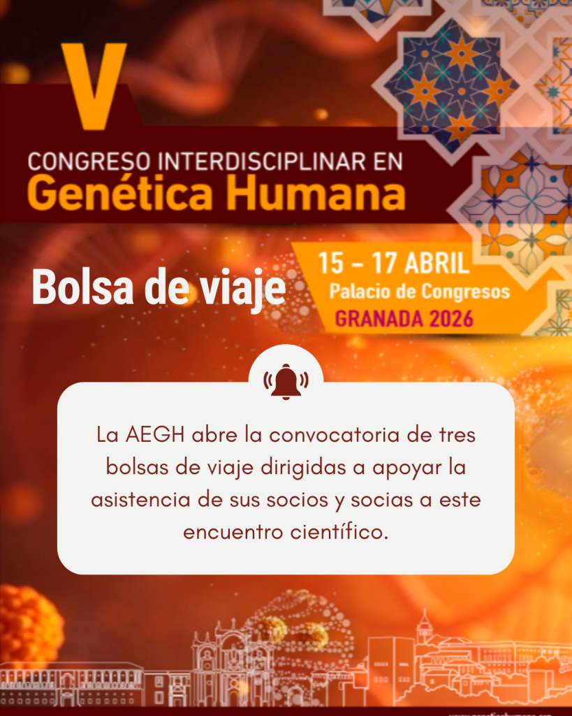 Con motivo de la celebración del XXX Congreso AEGH y V Congreso Interdisciplinar en Genética Humana, que tendrá lugar del 15 al 17 de abril de 2026 en el Palacio de Congresos de Granada, la Asociación Española de Genética Humana (AEGH) abre la convocatoria de tres bolsas de viaje dirigidas a apoyar la asistencia de sus socios y socias a este encuentro científico.