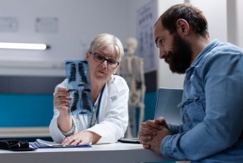 Doctor explaining radiography diagnosis to man with disease in cabinet
